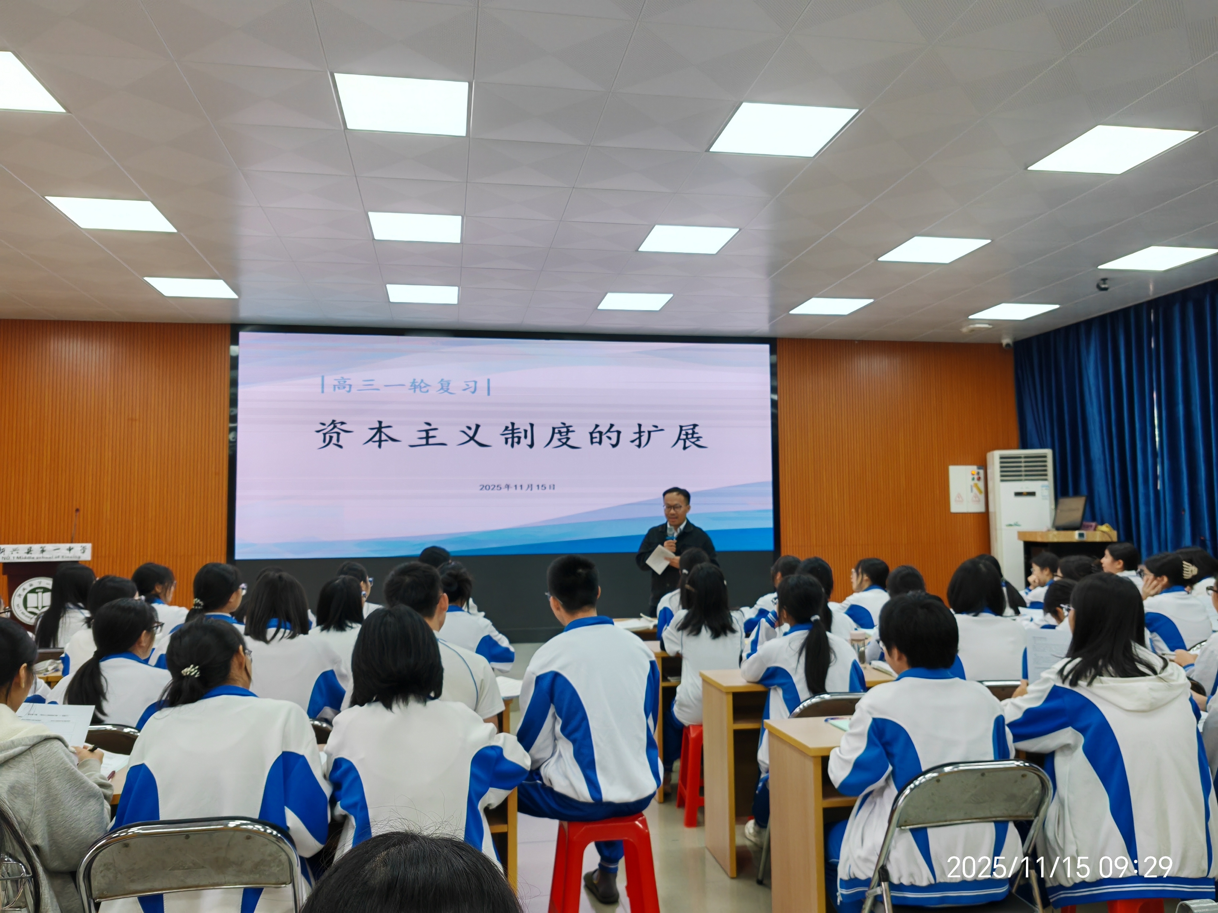 在高三年级的《资本主义制度的扩展》同课异构中,广东省县域普通高中丁文贵头雁教师工作室成员、新兴县第一中学李权老师从“扩展的全球进程(为何席卷全球)扩展的多样性(是简单的“复制粘贴”吗)扩展的深远影响(带来了怎样的深刻变革)”三维度结构,以学术观点“外延式扩展与内涵式扩展”来落实“资本主义制度的扩展”的必备知识。广州市章强名教师工作室成员、广大附中南沙实验学校黄欢威老师则从单元视角入手,在风趣幽默中阐释了西方国家“以民主政治为基本特征的新型政治体制成为西方国家普遍的政治体制;同时,资产阶级政治体制的历史局限性逐渐凸显”核心要义,以“19世纪,资本主义在全球范围内扩展的原因、表现、影响”构建逻辑,基于学术背景以落地对学生的价值引领-资本主义制度的剥削性、殖民性,终将走向灭亡的历史认识。