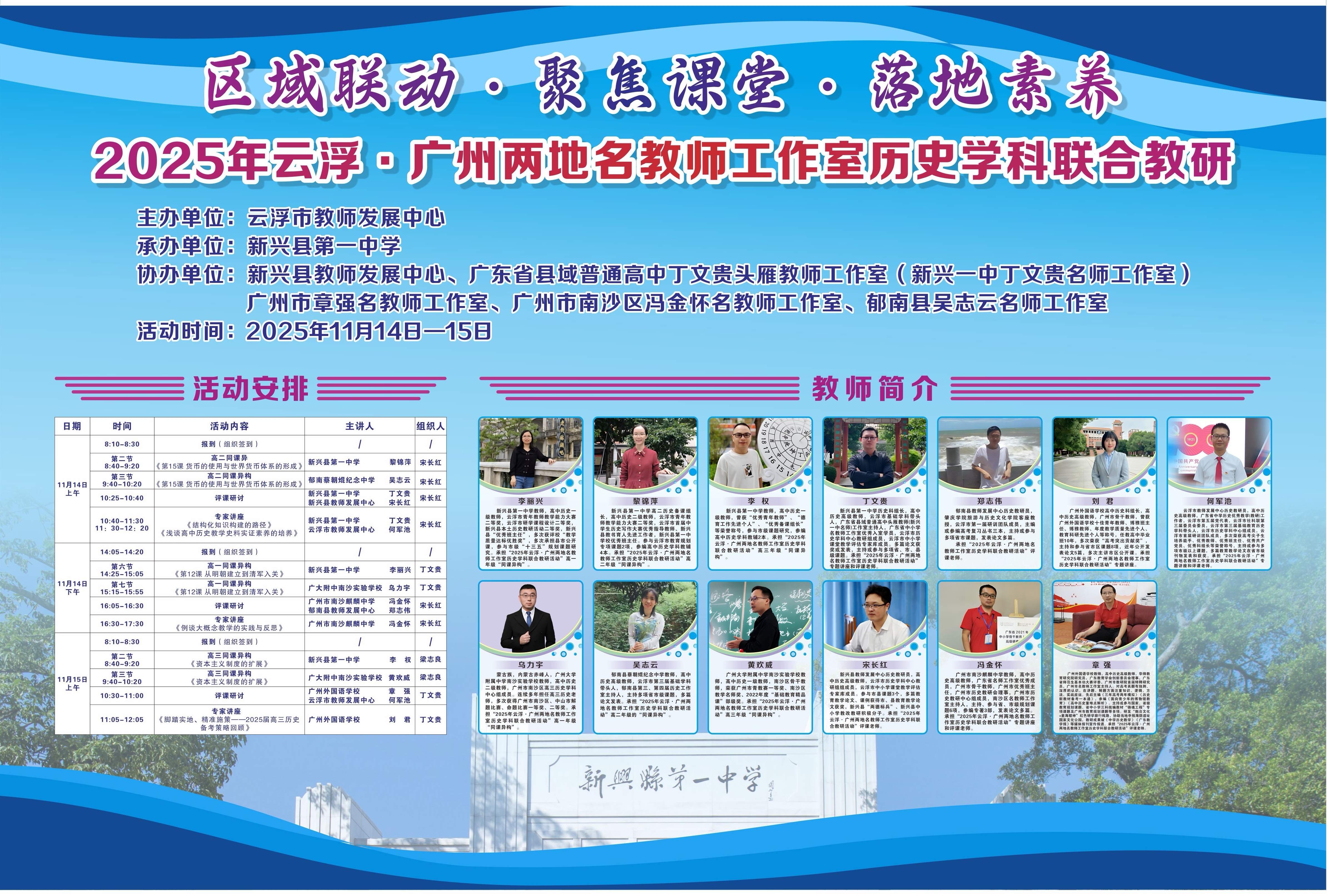 秋风送爽,阳光明媚。11月14—15日,2025年广州・云浮两地名师工作室历史学科联合教研活动在云浮市新兴县第一中学举行。本次教研活动由云浮市教师发展中心主办,以“区域联动・聚焦课堂・落地素养”为主题合法的配资公司,旨在深化区域教学改革,探讨指向核心素养的中学历史教学,提高教学质量以及提升教师教研水平。