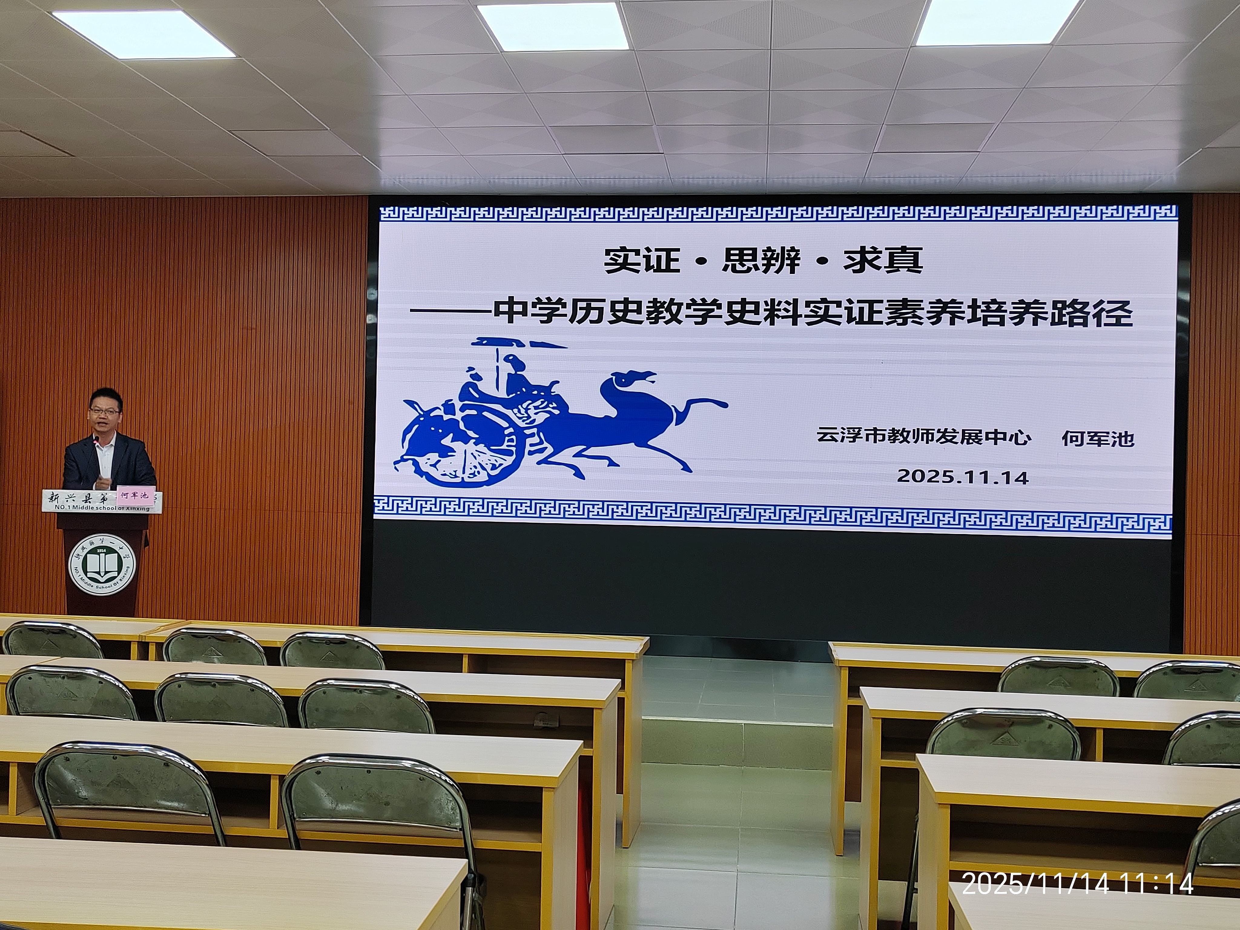 广东省县域普通高中丁文贵头雁教师工作室主持人丁文贵老师作“知识结构化的构建 —— 以《货币的使用与世界货币体系的形成》为例” 的专题讲座,从“理念先行”“路径生成”与“总结升华” 三维度展开。云浮市教师发展中心历史学科教研员何军池老师作《实证・思辨・求真 —— 中学历史教学史料实证素养培养路径》专题讲座,从“价值内涵、素养方法、存在误区”等维度予以阐述,提出“实证-思辨-求真”三维路径,深化思辨、坚守求真;广州市南沙区名教师工作室主持人冯金怀老师以《例谈大概念教学的实践与反思—从“世界殖民体系与亚非拉民族独立运动”谈起》的专题讲座,从“概念凝练、逻辑构建、问题设计、教学评一体化”等维度进行解构。广州市章强名教师工作室成员、广州外国语学校历史科组长刘君老师作“脚踏实地、精准施策”专题讲座,分享广州外国语学校2025届高三历史备考经验,聚焦“科组协作、集备落实、学生勤学”三大维度,为2026届高三历史备考提供了可复制示范。